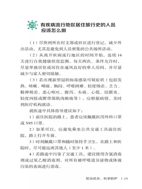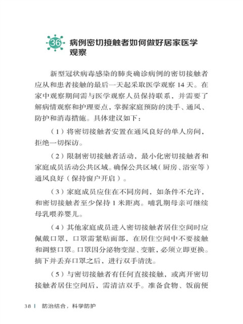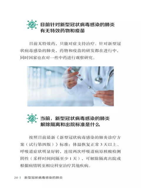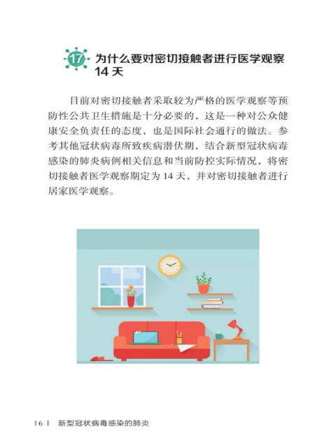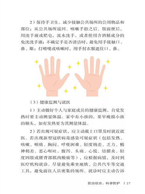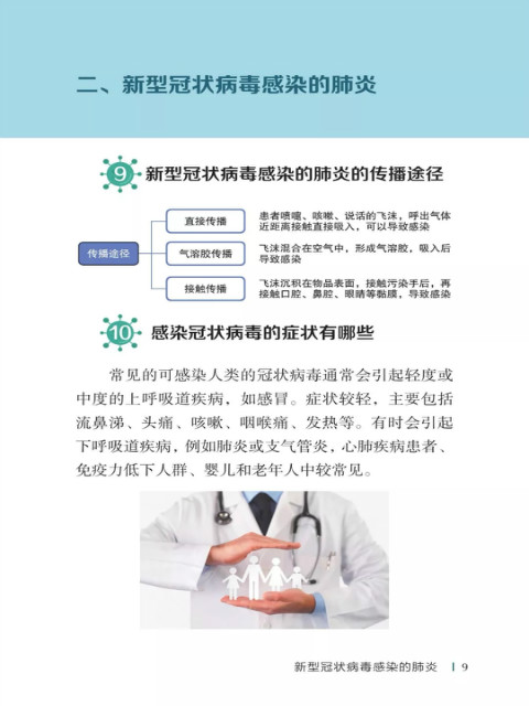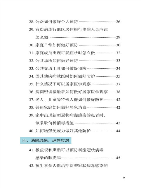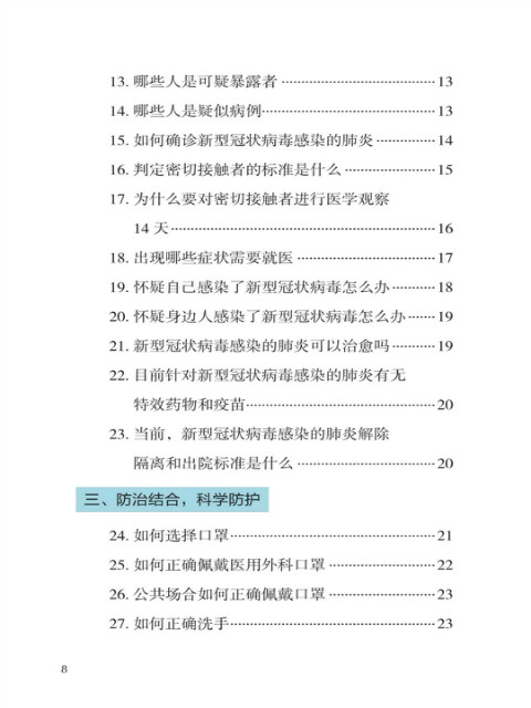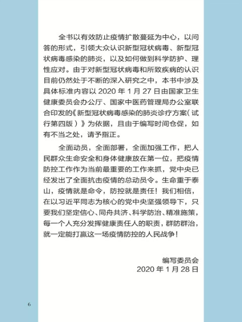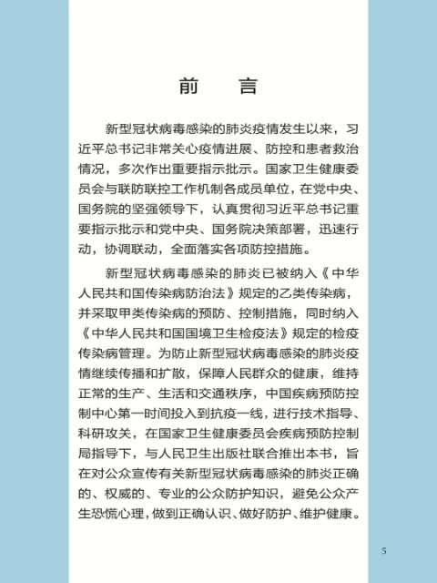 中国疾病预防控制中心编写的《新型冠状病毒感染的肺炎公众防护指南》,日前出版发行。此书聚焦公众个人与家庭防护、居家医学观察、理性就医、心理疏导等防治细节,通过问答形式解读新型冠状病毒感染的肺炎有关问题疑惑,引导公众正确认识,积极做到防治结合、科学防护、消除恐慌、理性应对。此书包括图书、电子书、网络版读物等多种形式,第一批图书已紧急送往武汉抗击疫情第一线,电子书、网络版读物在学习强国、健康中国、人卫健康、掌阅等多个网络平台、微信公众号公益传播,并为全国各地提供可印制的PDF版本。