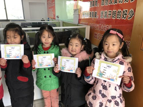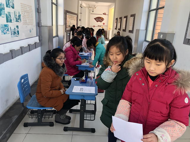 2018年12月28日中午,迎着双语节的氛围,一二年级学生进行了口语测试。口语挑战共四关,第一关:小试牛刀(图片认读);第二关:初展才华(单词、句型认读);第三关:迎难而上(课文认读);第四关:极限挑战(口语交际、才艺展示)。每过一关可获得一枚过关章,集齐4枚印章,获得“口语小达人”称号。