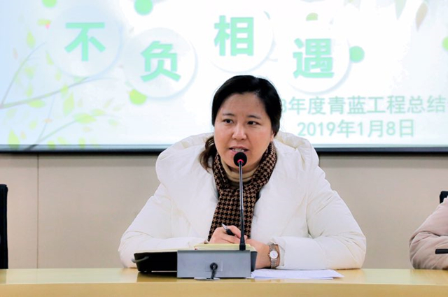 会上,教师发展中心许虹主任首先就 2018 年度学校青蓝工程的工作进行了总结汇报。 2018 年是学校教师发展成绩斐然的一年,一位老师获评苏州大市学科带头人,一位老师获评“苏州市学科双优之星”“园区首届金鸡湖教育领军人才”,一位老师获评中小学高级教师,这些都是建校十多年来学校自己培养的“第一位”。多位老师获评区级骨干教师,区级学科带头人获评率百分之百。青蓝工程的各项活动也开展得如火如荼:闻涛书苑定期开展读书交流活动,为书香校园增添了一抹亮色:闻涛讲坛为优秀老师们搭建了交流展示的平台,一次次经验分享让青年教师的工作更加细致、踏实:闻涛青年教师成长工作室贴合学科特点以“抱团成长”的形式将青年教师的发展带进了快车道。硕果累累纵然值得骄傲,但心知不足更能推动前进的步伐。许虹主任指出我校青年骨干教师的指数和高学历骨干教师的指数均有较大的提升空间,这也是胜浦实小老师们未来努力的方向。