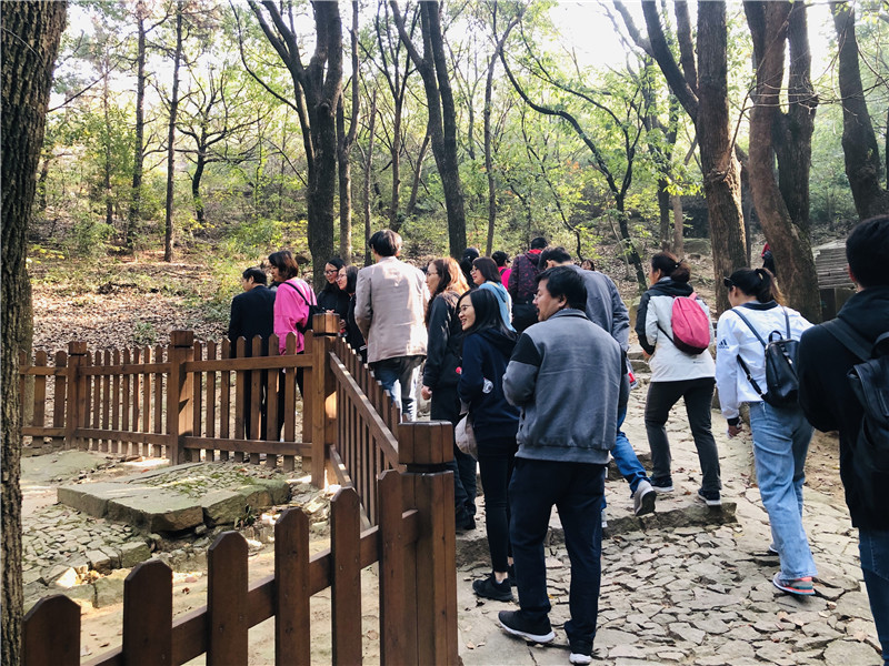 首先到达的是景点“佛手”,大家精力充沛,笑容满面,一路登高,一路欢声笑语不断,20分钟左右,一行人已经全数抵达“天池”景点,这里奇秀清悠,宛如仙境,令人心旷神怡。稍作休息之后,大家继续登高,途径洗心池、莲花亭、御览亭、云亭等,每一处小小的景都给教职员工们带来不小的惊喜,忍不住感叹大自然金秋之美。