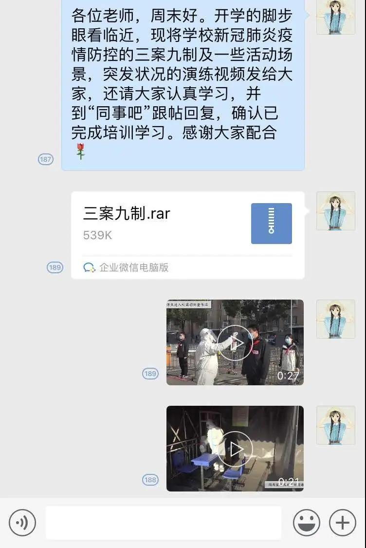 本次培训由学校校长室精确指引,由教师发展中心精心组织,主要学习学校制定的新型冠状病毒感染的肺炎疫情防控的“三案九制”及一些活动场景、突发状况的应急处置演练视频。科学、详实的三条方案、九项制度、六个场景及状况的演练,让老师们对新型冠状病毒肺炎防控工作以及开学后的工作有了更全面、更接地气的知晓和掌握。